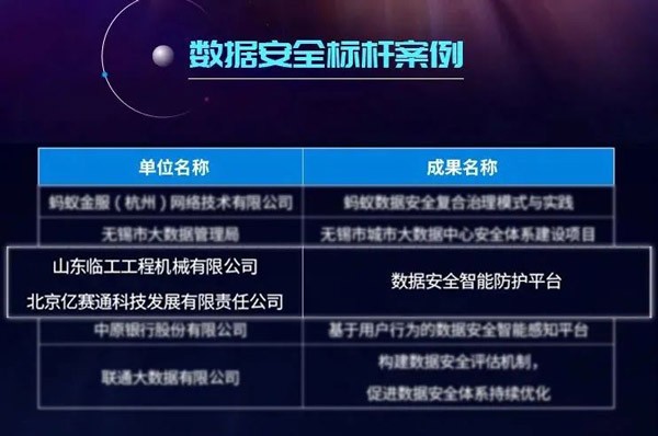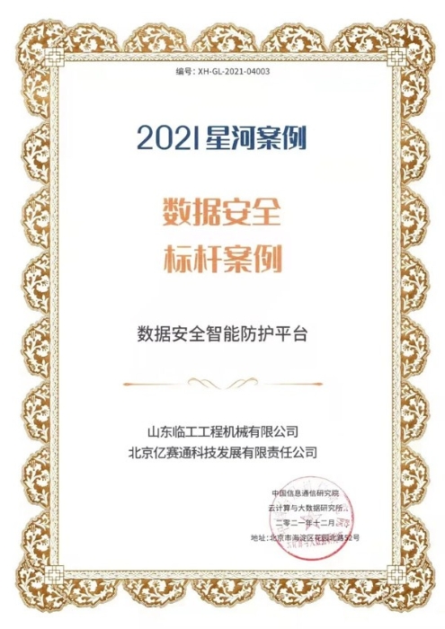 山东bsports必一体育工程机械有限公司和北京亿赛通科技发展有限公司联合申报的“数据安全智能防护平台”应用成果凭借其专业的技术及完善的解决方案,从350余份项目中脱颖而出,成功当选本届大数据星河案例“数据安全标杆案例”。