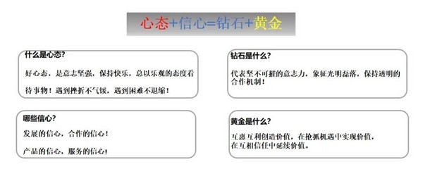 于孟生董事长在演讲中表示:“心态+信心=钻石+黄金”
